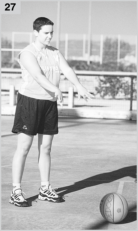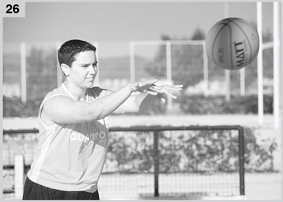 Pase de pecho: es el pase fundamental en el baloncesto; el primero que se aprende. Cogiendo el balón con las manos a la altura del pecho y los codos no demasiado separados del cuerpo, realizamos una extensión de los brazos con un golpe final de muñeca. Las palmas de las manos deben volverse hacia fuera, con los brazos extendidos y paralelos al suelo (fig. 26). Podemos ayudarnos, para dar más impulso al balón, dando un paso hacia delante con un pie en el momento de la extensión de los brazos.