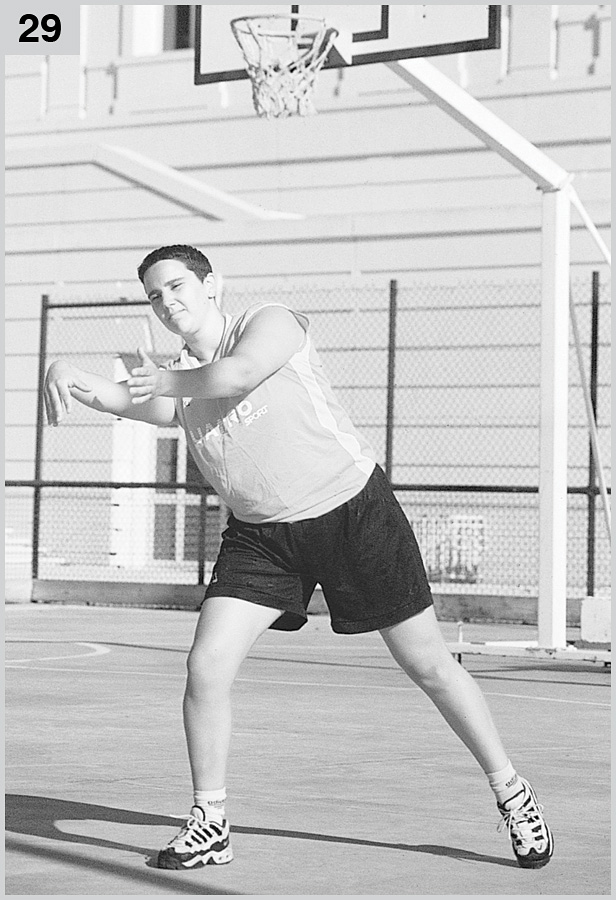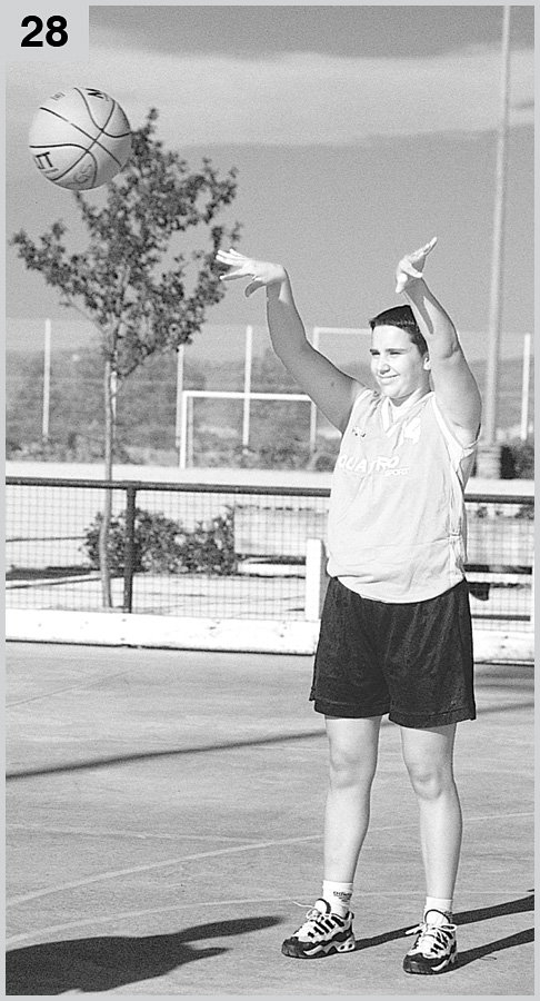 Pase por encima de la cabeza: en este caso, la pelota, antes de lanzarla se encuentra justo por encima de la cabeza, nunca por detrás. Se trata de un pase que suelen utilizar los pívot después de coger un rebote. Se realiza extendiendo los brazos y dando un golpe de muñeca, como en el pase de pecho, si bien esta vez los brazos se alzarán y se dirigirán hacia abajo, de forma que las manos acaben orientadas hacia el pecho del defensor (fig. 28). Es muy importante que la trayectoria sea recta, ya que el balón tiende a describir una parábola si no se le imprime la fuerza necesaria.