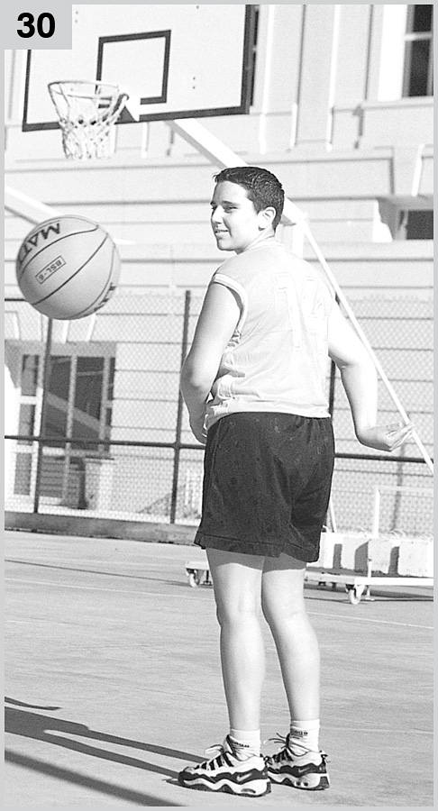 Otros pases: cuando el jugador domine estos pases, puede aprender otros con una mano. El más común es el pase lateral con una mano. Puede ser a corta y media distancia, apoyándose siempre en un pivote lateral y buscando el mejor ángulo. En estos casos el golpe de muñeca es fundamental, ya que modifica la dirección, lo cual requiere un mayor dominio del balón. El pase por detrás de la espalda es de una gran espectacularidad. Todo depende del empuje de la muñeca (fig. 30). Existen otros tipos de pase que se podrían considerar de fantasía, ya que su cometido es llamar la atención del público y animar el juego.