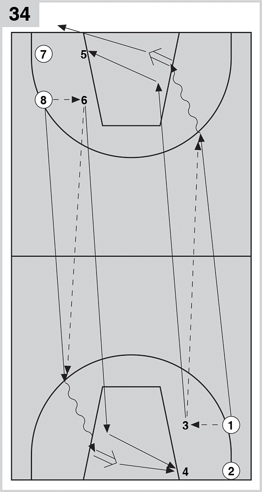 Ejercicio n.o 16: En esta ocasión se realiza un pase corto con las dos manos. Mientras el jugador exterior corre, el interior, que puede realizar un par de botes de aproximación, ejecuta un pase de béisbol para que el primero pueda realizar una entrada en el otro campo (fig. 34).