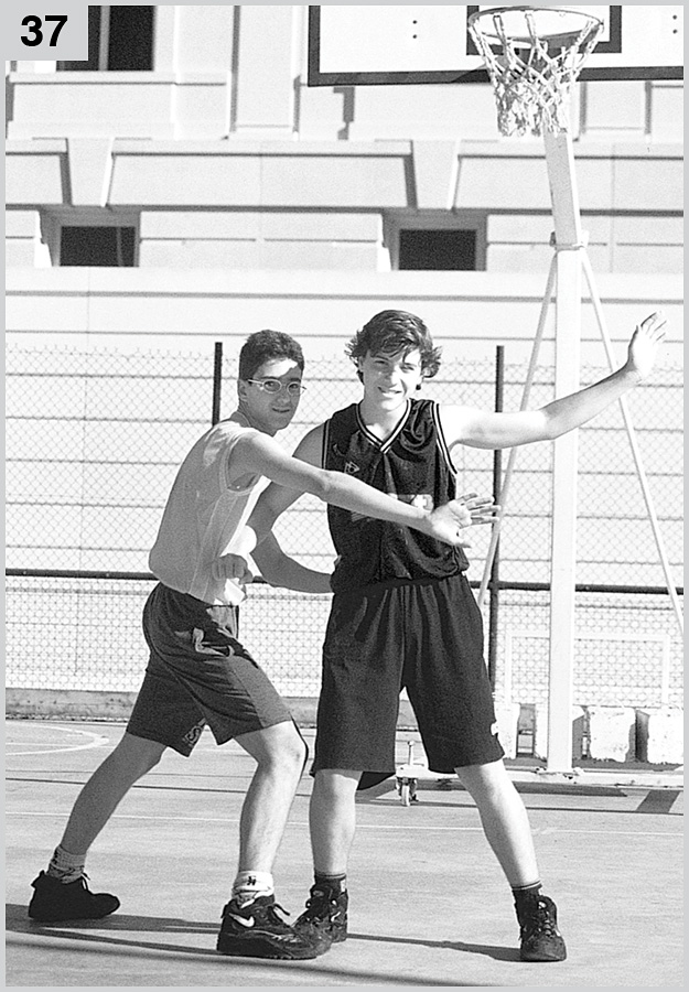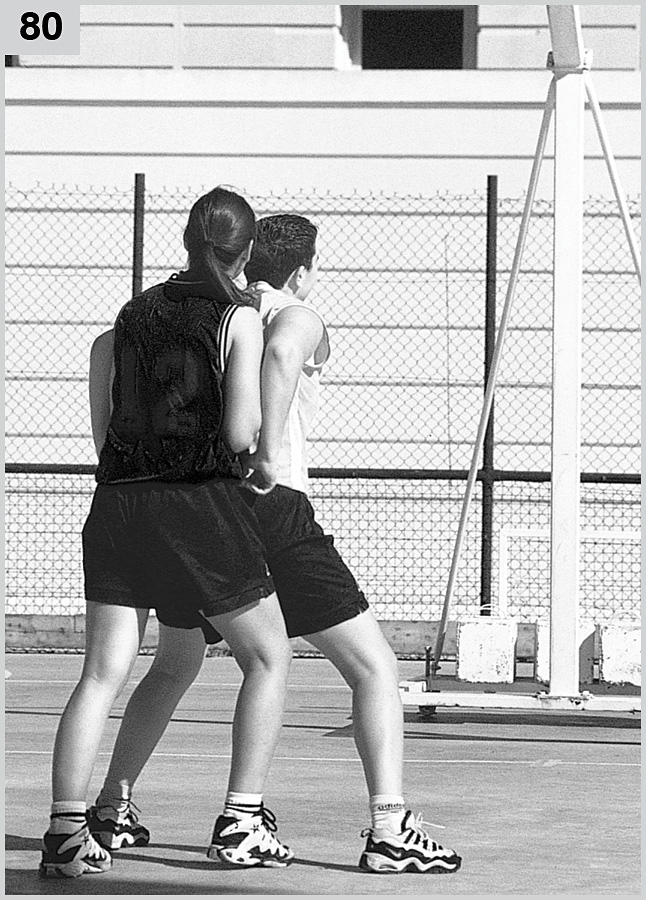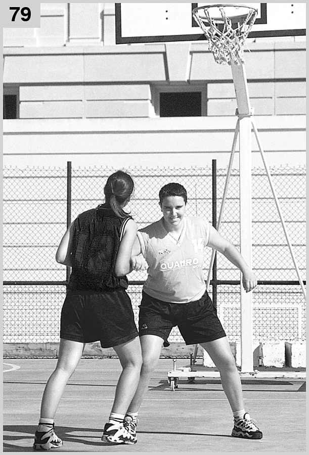 Cuando se lanza, el defensor tiene que ir a buscar su atacante con el pie más cercano para contactar con él con el antebrazo (fig. 79). Aquí debe observar el movimiento del atacante y pivotar sobre el pie para ponerse de espaldas al contrario y encarar la canasta. El defensor sólo puede aguantar al atacante con los brazos flexionados a la altura de los hombros (fig. 80). El centro de gravedad del defensor tiene que estar bajo, por lo que flexionará las rodillas para mantener el equilibrio.