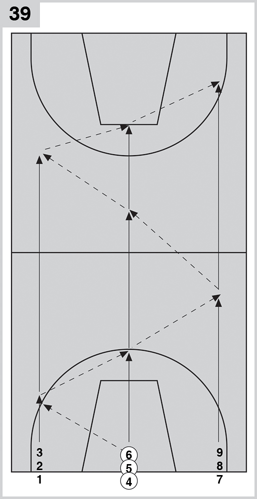 Ejercicio n.o 19: Este ejercicio requiere más organización que el anterior. Para no hacer pasos en falso, el jugador debe deshacerse del balón lo más rápidamente posible (fig. 39).