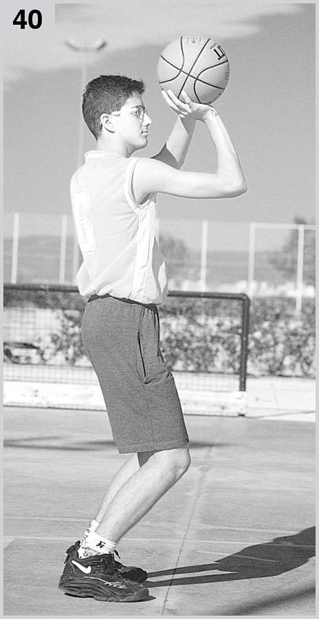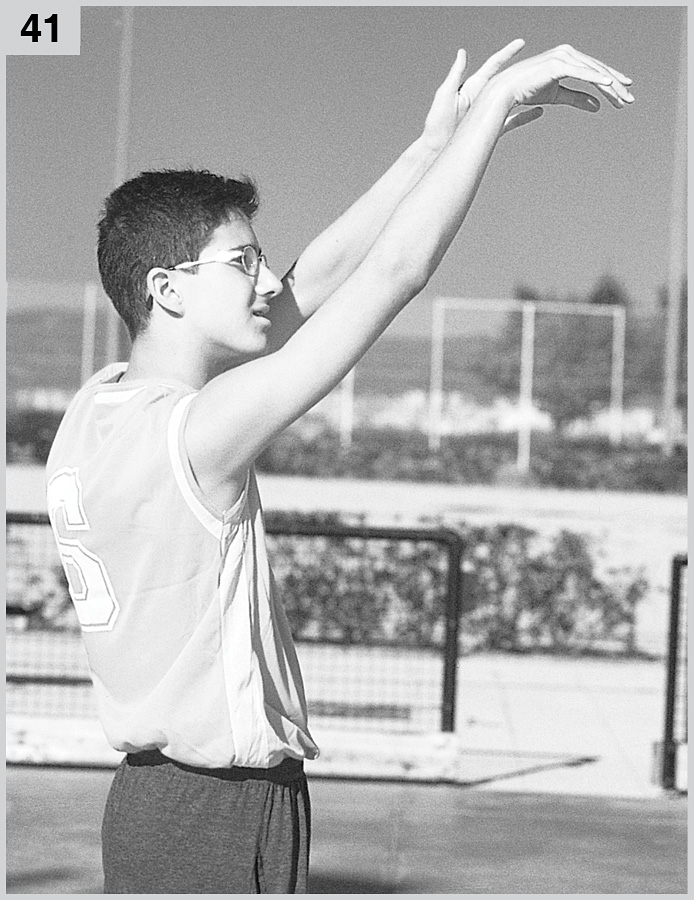 Una vez situados en la posición inicial, el brazo que lanza debe realizar una extensión, con un movimiento final de golpe de muñeca, dejando la mano abierta y dirigida hacia la canasta. El brazo de apoyo también debe realizar una extensión, compensando la acción de tiro (fig. 41).