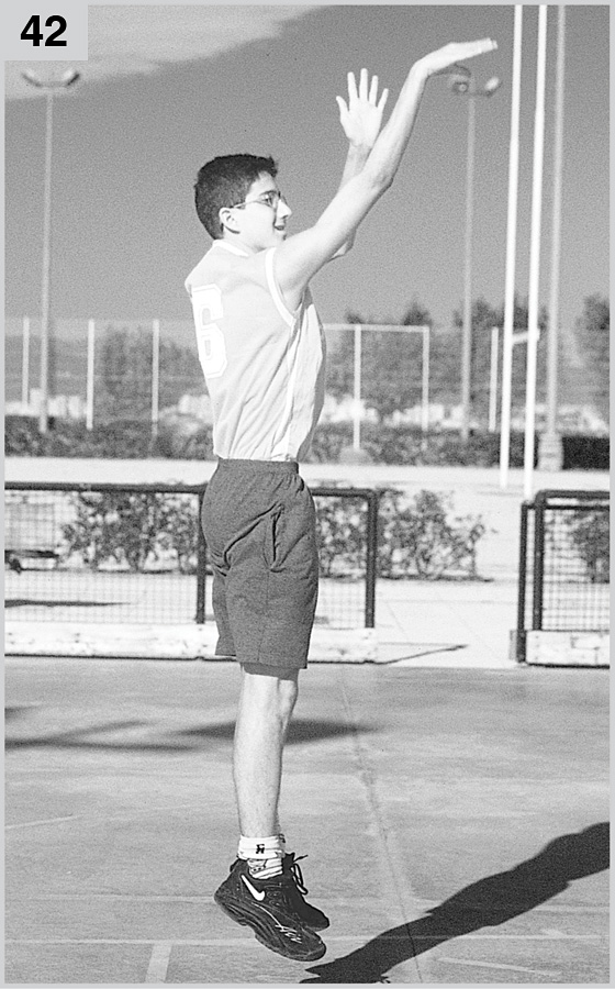 El movimiento de extensión de brazos debe coordinarse con el de extensión de piernas. Primero empieza el salto y después se estiran los brazos. Lo más importante es que el salto sea vertical y el jugador caiga en el mismo lugar desde el que ha saltado (fig. 42). Esto nos ayudará a tener un buen equilibrio durante el lanzamiento, que se produce en el aire. Cualquier movimiento que desplace el cuerpo de su vertical influirá en el lanzamiento.