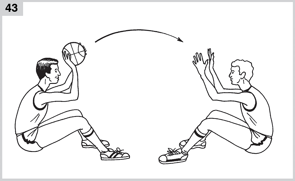 Ejercicio n.o 20: Sentados, se realizará un lanzamiento para que lo recoja el compañero. De este modo se desarrolla el movimiento de los brazos (fig. 43).