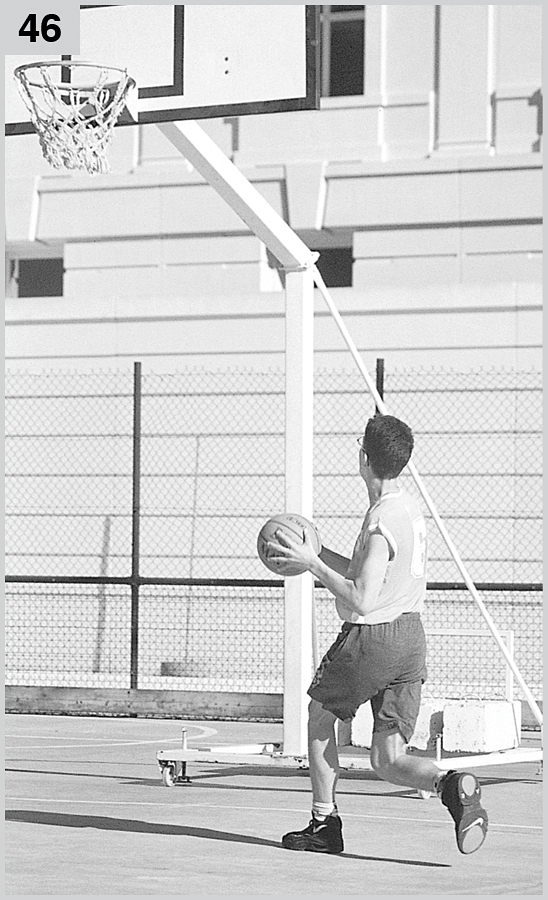 La entrada posee una técnica de ejecución que los jugadores más jóvenes deben aprender. El primer paso permite ganar espacio, por lo que deberá ser largo. El pie de pivote es el del mismo lado que la mano que bota el balón (fig. 46). El segundo sirve para ganar altura, y por eso es más corto que el primero, ya que nuestra intención es acercarnos el máximo a la canasta. Para ayudar a que este salto sea suficientemente alto, la pierna libre levanta la rodilla, proporcionando mayor impulso (fig. 47).