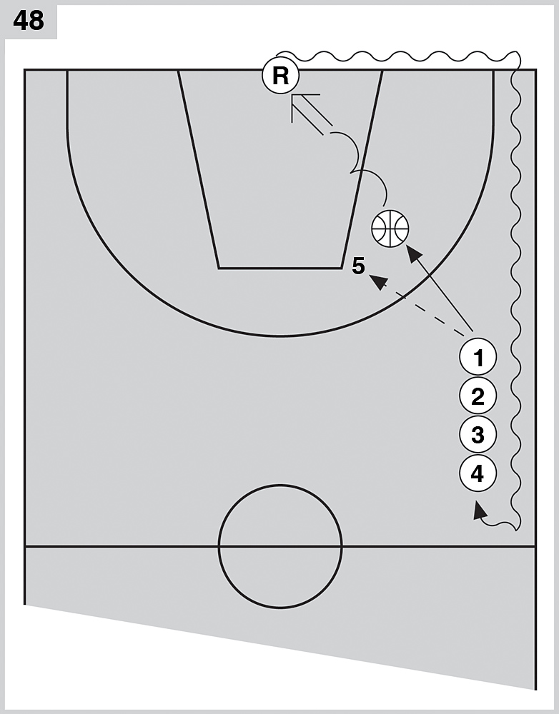 Ejercicio n.o 24: Para desarrollar la coordinación de los pasos con el bote, el entrenador colocará el balón sobre la palma de la mano, y el jugador lo recogerá tras entrar (fig. 48).