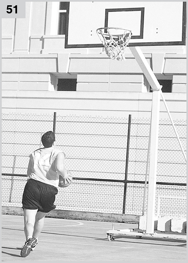 El primero es para los niños que empiezan a jugar, que ya saben ejecutar la entrada, pero aún no tienen suficiente dominio de balón para lanzar con una sola mano. Supongamos que el jugador se encuentra en la parte derecha del campo y va a realizar un aro pasado acabando por la izquierda. Botando con la derecha, hará un cambio de mano (técnica que veremos en el próximo apartado) para botar con la izquierda. El primer paso de la entrada, dado con el pie izquierdo, se dará desde el lado derecho y nos situará en el izquierdo (fig. 51). El segundo, ya en el lado izquierdo, orientará el cuerpo hacia la canasta, orientando la punta del pie hacia el aro. De esta manera, se podrá ejecutar un correcto tiro con la izquierda (fig. 52).