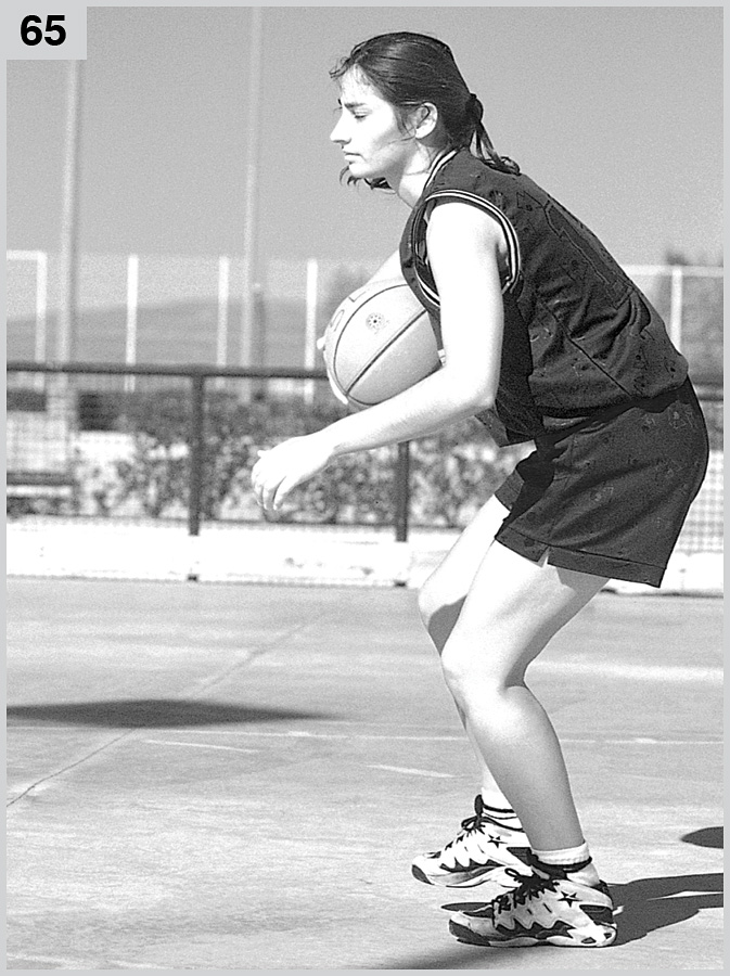 El reverso avanzado tiene una técnica muy parecida. La única diferencia que existe se da en el momento en que se produce el cambio de mano. Con la misma posición inicial, el jugador empieza el giro llevándose la pelota con la misma mano que estaba botando, la contraria al pie avanzado (fig. 64). Cuando está de espaldas al defensor, hace botar la pelota entre las piernas para que después del bote, la otra mano recoja el balón y salga botando hacia delante (fig. 65).