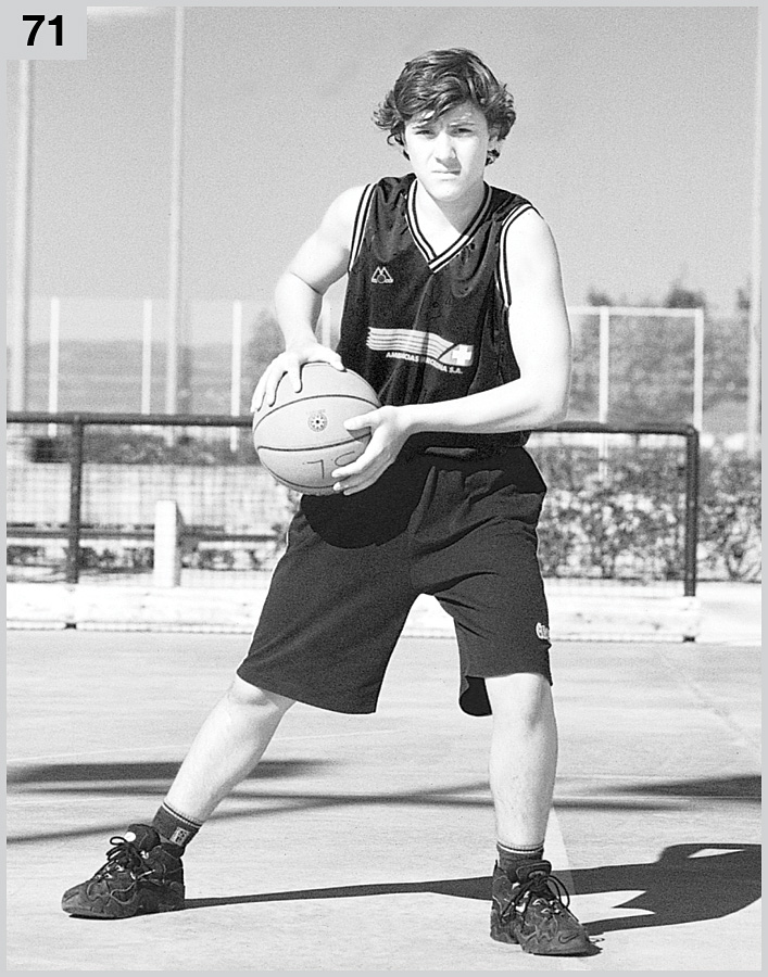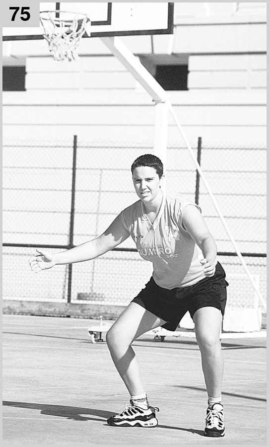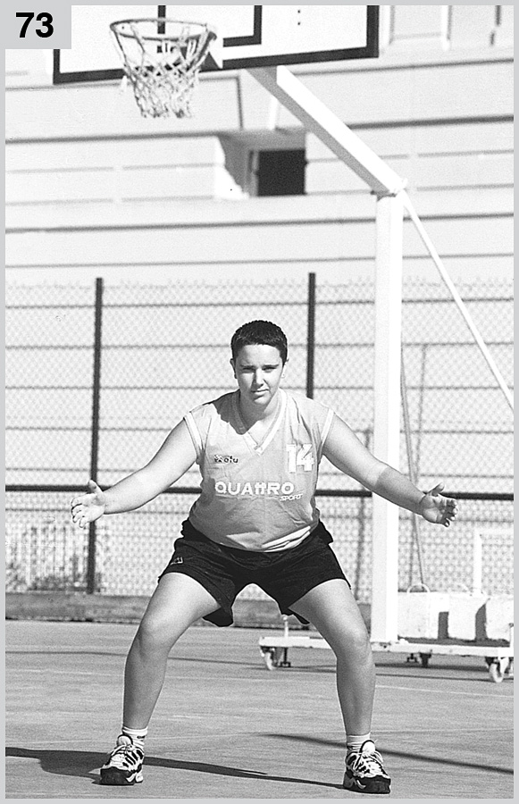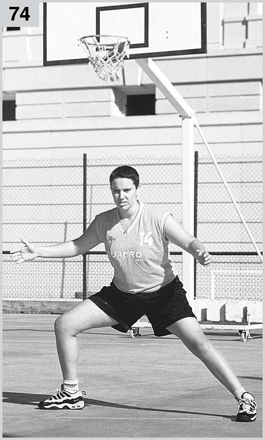 El defensor en posición básica ha de tener los pies separados a una distancia similar a la de los hombros. Las rodillas están flexionadas para que el centro de gravedad esté bajo; de esta manera podrá mantener el equilibrio y desplazarse con mayor facilidad y rapidez. La espalda debe estar erguida pero no demasiado, a fin de no forzar los movimientos. Las manos estarán abiertas y activas, preparadas para robar un balón si el atacante lo enseña demasiado. La cabeza alta, mirando hacia delante (fig. 73).
