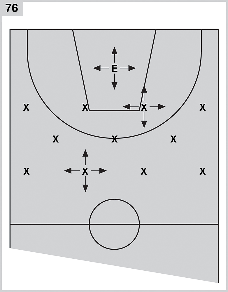 Ejercicio n.o 33: El entrenador señala con los brazos la dirección hacia donde deben desplazarse los jugadores. Es necesario dejar bien claro que estos desplazamientos han de hacerse desde la posición básica defensiva (fig. 76).