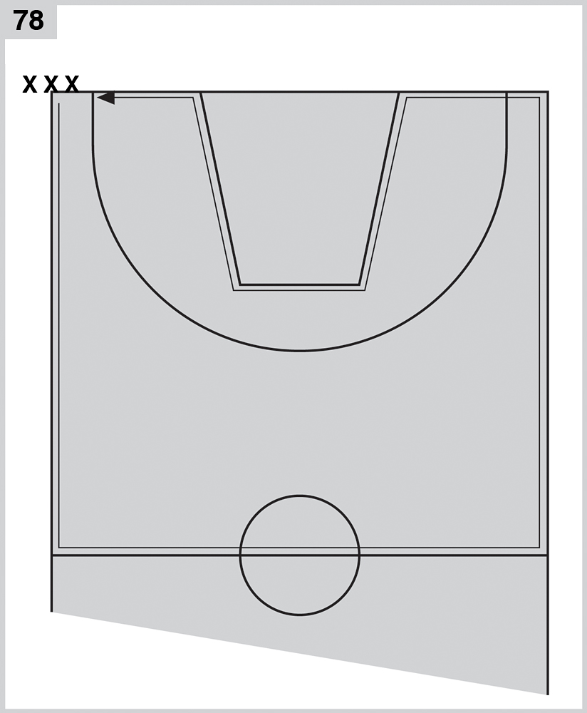 Ejercicio n.o 35: Se realiza el desplazamiento defensivo siguiendo el circuito marcado. En cada esquina se deberá pivotar para hacer un paso de caída. El entrenador puede cambiar el sentido cuando lo desee (fig. 78).