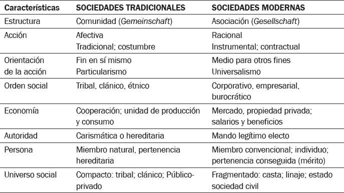 Con el advenimiento de la modernidad, se produce el paso de las antiguas comunidades de carácter simple a las sociedades modernas de carácter complejo. La mayor parte de autores clásicos de las ciencias sociales participan de una imagen común, de un cierto acuerdo en la tentativa de explicar este cambio histórico a partir de la disolución de las comunidades originarias de carácter simple y el tránsito hacia las sociedades modernas de carácter complejo (Giner, 1974). Con su distinción entre comunidad (Gemeinschaft) y asociación (Gesellschaft), Ferdinand Tonnies (1855-1936) es el autor clásico que mejor expresa esta bipolaridad.