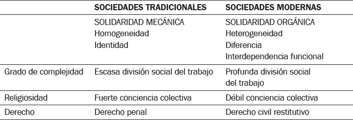 En la división del trabajo social, Émile Durkheim (1858-1917) se plantea el tránsito de la vida tradicional a la vida moderna y afirma que mientras que en las “sociedades simples” los vínculos de solidaridad (solidaridad mecánica) se dan gracias a la similitud de las conciencias y a un fuerte sentimiento de identidad entre los individuos, en las “sociedades complejas” es el proceso de diferenciación del trabajo lo que da origen a una nueva forma de solidaridad (solidaridad orgánica) basada en la diferencia.2