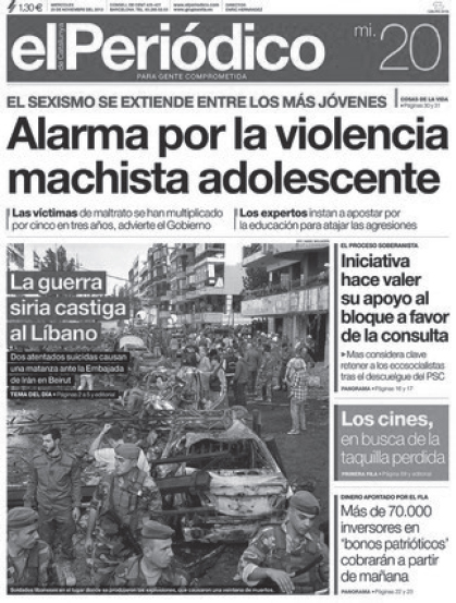 Figura 23. Portada del Periódico de Cataluña (19/11/2013) sobre la violencia machista que puede contribuir a provocar cierta alarma social.