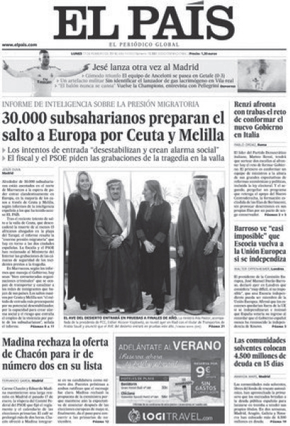 Figura 24. Portada de El País (17/02/2014) sobre la inmigración subsahariana que puede contribuir a provocar cierta alarma social.