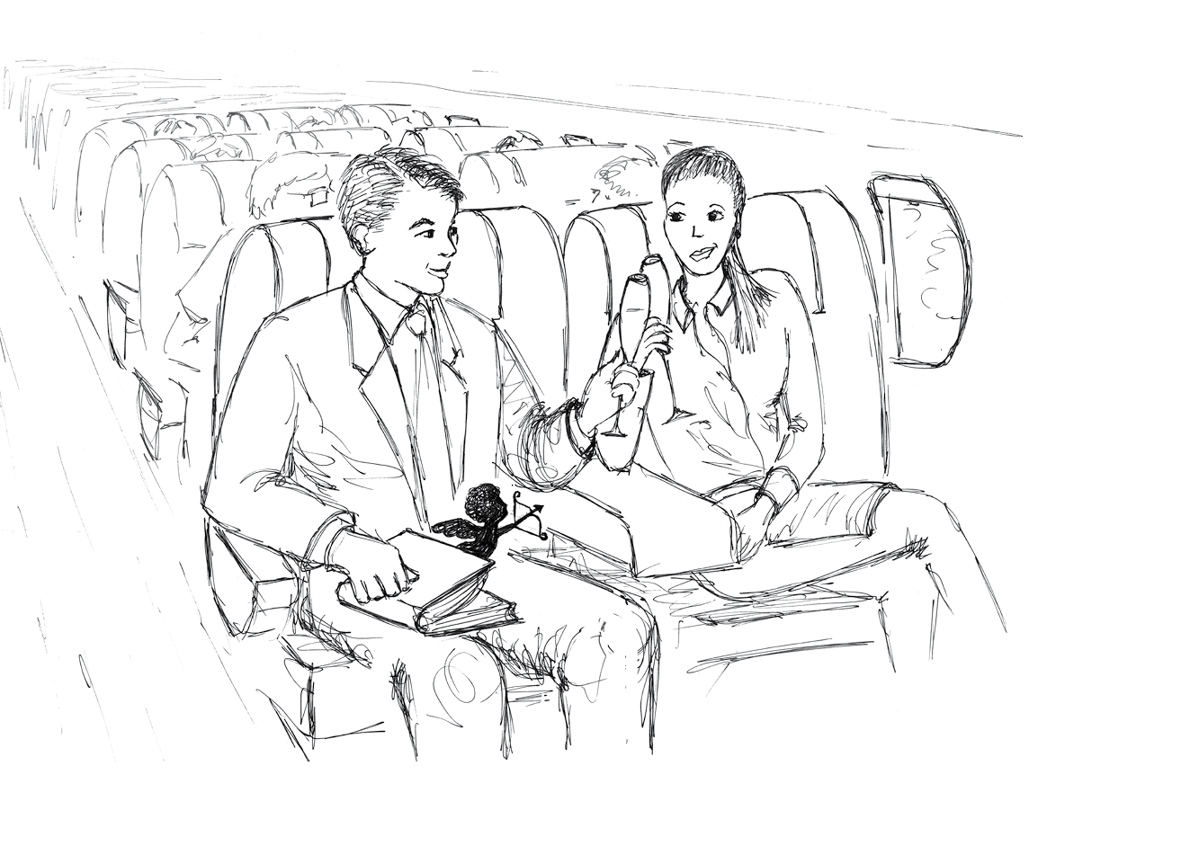 Roberto estaba empapado y rezumando champán, pero, aun así, con parsimonia, recuperó el traje que le había entregado a la azafata para colgar en una percha y se fue al lavabo. Poco después, salió vestido impecablemente, desprendiendo elegancia.