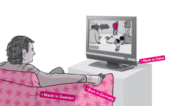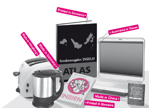 ¿Cómo podemos reconocer el talento viajero de estos objetos? El primer punto de referencia es el país donde han sido fabricados. Esto se puede averiguar por las pequeñas etiquetas que llevan pegadas o impresas en alguna parte. ¿De dónde procede, por ejemplo, mi tostador? De Hong Kong. ¿Y el despertador? De China. ¿De dónde viene el ordenador? En el mío pone Assembled in Taiwan (montado en Taiwán). Hasta algunos libros escritos en mi idioma han sido producidos en el extranjero. Por ejemplo, mi atlas están impreso en Eslovenia. ¿Y el hervidor? ¡Excepcionalmente, procede de Alemania: Made in Germany! Esto solo rara vez sucede. Es tan infrecuente que el fabricante lo hace destacar. Pero el país donde se fabrican los objetos no es más que una etapa de la historia de su vida. Su viaje completo abarca desde la obtención de las materias primas hasta el uso final, en el vertedero o donde sea. Así pues, volvamos al casting: tengo pocos candidatos interesantes y un favorito secreto: mi ordenador portátil. Es una marca americana, el procesador se manufacturó en Múnich, el montaje se realizó en Taiwán. La verdad es que parece todo muy prometedor.