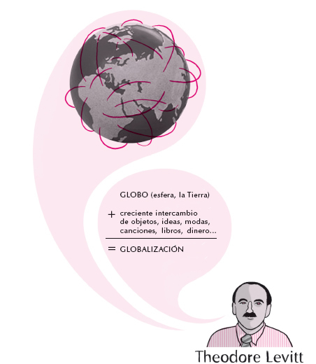El término «globalización» deriva de «globo», una esfera que recrea nuestro planeta y en el que están representados todos los países y mares. En 1983, el profesor de economía Theodore Levitt, americano pero nacido en Alemania, buscó una palabra para describir hasta qué punto toda la actividad económica del mundo es interdependiente hoy en día. Nunca antes había habido tanta gente intercambiando tantas cosas en todas las direcciones del planeta. Y no solo objetos, sino también ideas, moda, música... y, sobre todo, dinero. Ya nadie se dedica a afanarse para él solo, pensaba Levitt; ni siquiera un pequeño campesino de África. La manera en que nos relacionamos, lo que producimos y compramos tiene efectos en todas las demás personas del mundo. La economía ya no se limita a un pueblo, a una ciudad o a un país, sino que está extendida por todo el planeta, es decir, «globalizada»: se había dado nombre a la «globalización».