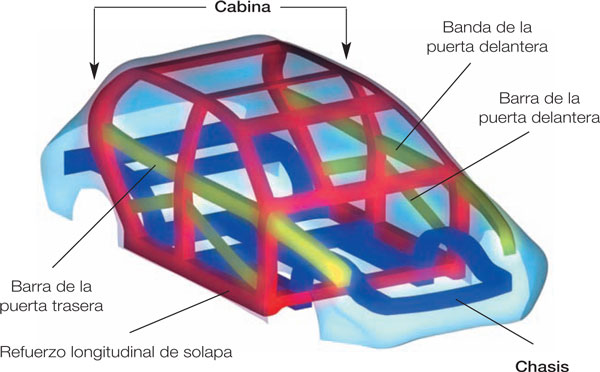 La cabina (fig. 6) del coche se ha estudiado y mejorado para que, en caso de choque, sea relativamente indeformable. Esta celda está formada porel chasis más las estructuras de refuerzo del tipo arcos de seguridad longitudinales y transversales.