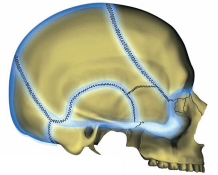 Pero el hueso craneano, por muy deformable que sea, no lo es únicamente debido al material del que está hecho. El hueso cohabita con una red de suturas. La fragmentación mediante suturas aumenta la resistencia al traumatismo de la caja craneana. Las suturas absorben las presiones, como lo hacen las juntas de dilatación. Su función no es generar movimientos, sino simplemente sufrir las presiones del movimiento y preservar lo máximo posible la integridad del cráneo. En este sentido, el cráneo es un verdadero puzle (fig. 5). Al igual que la carrocería de un coche, las numerosas piezas que encajan en la cabina craneana permitirán la adaptación a las diferentes tensiones y los distintos choques, y repelerán la inminencia de la fractura.