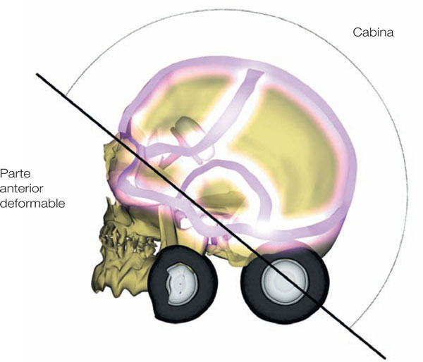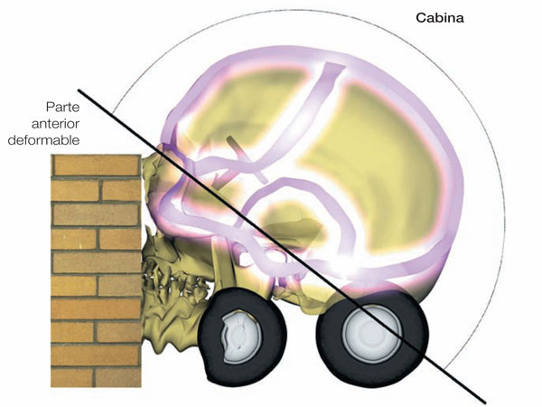 Para comprender las exigencias que requiere la protección de un móvil de este tipo, les propongo, durante todo nuestro análisis, recurrir a una comparación. Si el cráneo es un móvil con función protectora, es comparable a un automóvil que, al mismo tiempo que se desplaza, protege a los pasajeros que transporta. Así, cuando se trata de mejorar la seguridad de los pasajeros, los constructores de automóviles encuentran el mismo tipo de problemas que el cráneo cuando tiene que proteger el encéfalo. En lo que se refiere a los automóviles, la mejora de la protección sólo pudo hacerse a posteriori, a raíz de las investigaciones realizadas a partir de crash-tests. La multiplicación de experimentos de choque ha permitido que evolucionen los diferentes elementos que componen un automóvil tanto en lo que se refiere a la forma y al material de los que están hechos como a su estructura. Los elementos en cuestión se pueden enumerar como sigue: