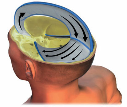 En realidad, el problema es más complejo. Como para el pasajero de un coche, el encéfalo debe poseer cierta libertad de movimiento, pero sin correr el riesgo de lesionarse con las asperezas de la cavidad craneana. La función de las diferentes meninges, duramadre, piamadre y aracnoides, es subvenir estos problemas técnicos. Pero, en caso de choque, un sistema autobloqueante complementario a la hoz y la tienda debe funcionar para evitar que el cerebro se aplaste, debido a su masa, contra las paredes óseas. Así pues, resulta necesario un sistema equivalente al airbag.