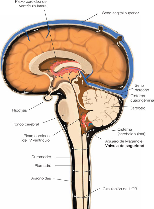 En la cadena neuromeníngea, esta válvula existe, es el agujero de Magendie. Dicho agujero facilita la evacuación instantánea del LCR fuera del sistema ventricular, como lo haría una válvula de seguridad (fig. 18).