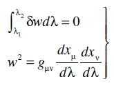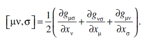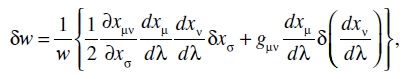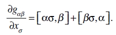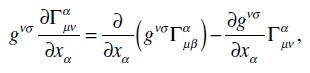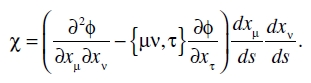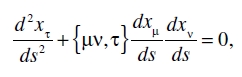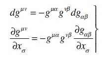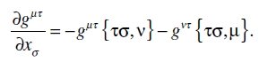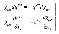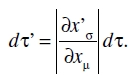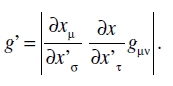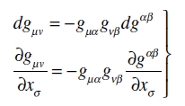 donde las gστ serán funciones de las xσ. Éstas ya no pueden ser dependientes de la orientación y el estado de movimiento del sistema de coordenadas «local», pues ds2 es una magnitud que se puede establecer por medidas de regla-y-reloj de sucesos puntuales infinitamente próximos en el espacio-tiempo, y definida independientemente de cualquier elección de coordenadas concreta. Las gστ deben escogerse aquí de modo que gστ = gτσ; la suma se extiende sobre todos los valores de σ y τ, de modo que la suma consta de 4 X 4 términos, de los cuales 12 se agrupan en pares iguales.
