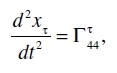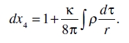 Notemos ahora que desde el primer punto de vista de aproximación las magnitudes Γτµν son todas pequeñas magnitudes de al menos primer orden. Una ojeada a (46) muestra así que en esta ecuación, desde el segundo punto de vista de aproximación, tenemos que considerar solamente términos para los que µ = ν = 4. Restringiéndonos a términos de orden más bajo obtenemos primero en lugar de (46) las ecuaciones