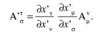 Las dx’σ se expresan como funciones lineales y homogéneas de las dxν. De aquí podemos considerar estas diferenciales de coordenadas como las componentes de un «tensor» del tipo particular que llamamos cuadrivector contravariante. Cualquier objeto que está definido con relación al sistema de coordenadas por cuatro cantidades Aν, y que se transforma por la misma ley