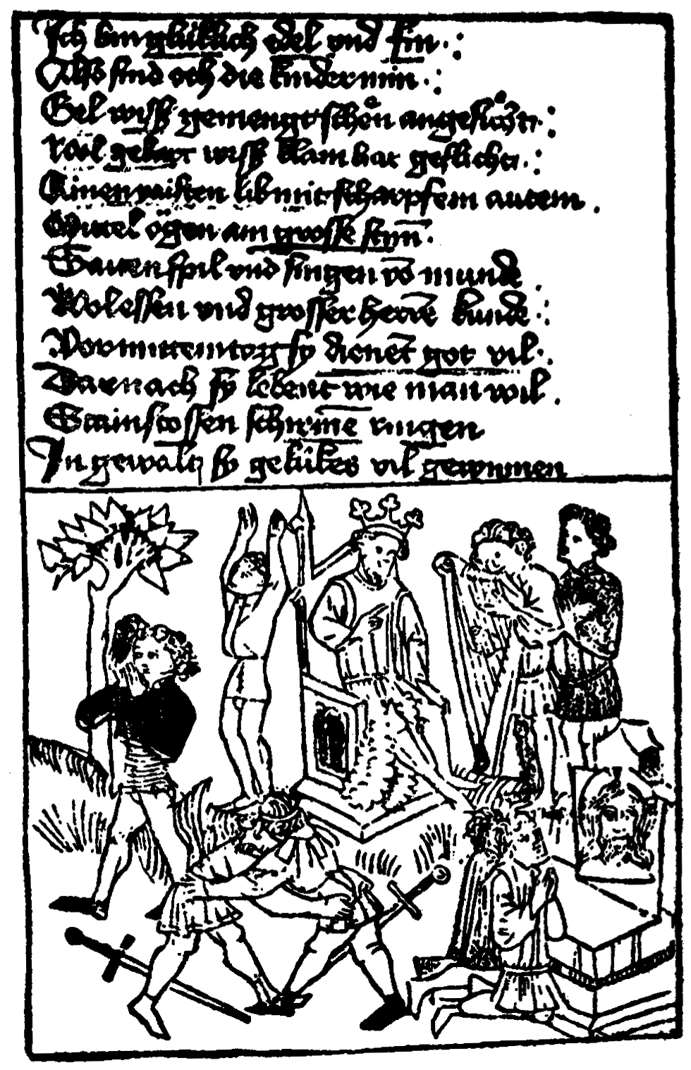 Exactamente lo mismo sucedió con el grabado en madera. En un principio se quiso sustituir con él a la miniatura y no existía el menor propósito de crear algo nuevo, algo que por su técnica se diferenciara de lo anterior. Todo lo contrario: si hubieran surgido dificultades al traducir el dibujo a pluma al nuevo procedimiento, probablemente se habría renunciado a él o se habría procurado suprimir estas diferencias. De cualquier modo, se procuraba obtener un resultado final idéntico. Se trataba de remplazar el dibujo manual e imitarlo en forma tan ilusoria que el consumidor creyera que seguía recibiendo lo mismo que antes —aunque probablemente esto le tenía muy sin cuidado—. Pues todas esas imágenes de santos, esos naipes y hojas volantes no eran sino bagatelas, a las que no se pedía gran cosa, con tal que el tema mismo y su representación correspondieran a los conceptos usuales.