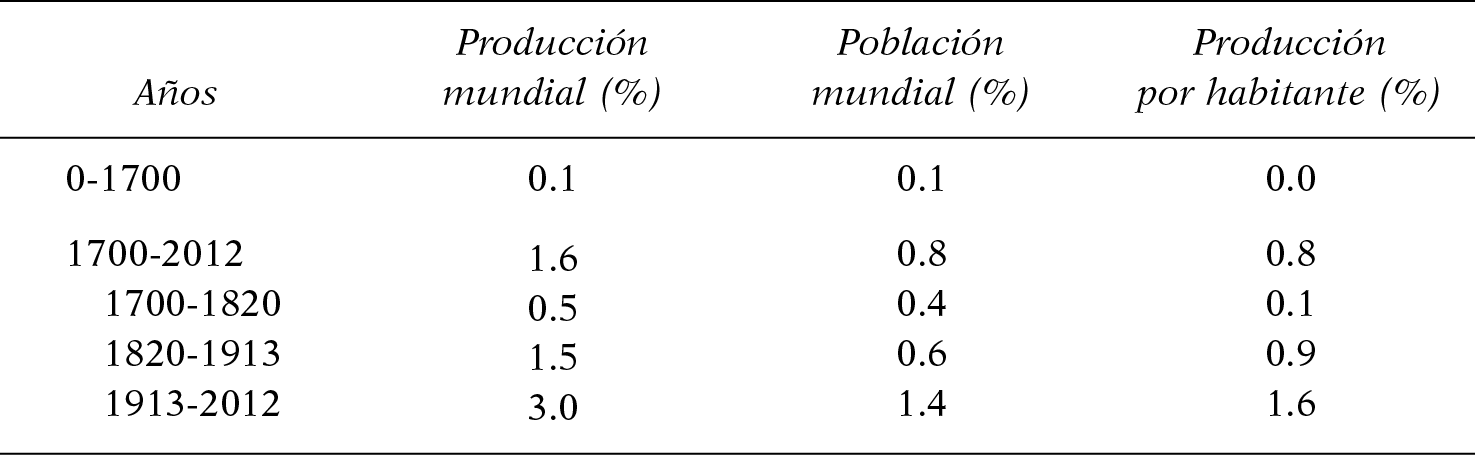 Se observa, en primer lugar, que el vertiginoso incremento del crecimiento a partir del siglo XVIII fue un fenómeno que implicó tasas de crecimiento anuales relativamente moderadas, y, en segundo lugar, que se trató de un fenómeno cuyos componentes demográficos y económicos tenían más o menos la misma magnitud. Según las mejores estimaciones disponibles, la tasa de crecimiento del PIB mundial entre 1700 y 2012 fue en promedio de 1.6% anual, de la cual 0.8% se debió al incremento de la población y 0.8% al concepto de aumento de la producción por habitante.
