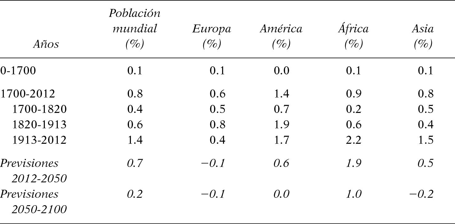 Si el ritmo del crecimiento demográfico observado entre 1700 y 2012 —es decir, de 0.8% anual en promedio— se hubiera dado desde la Antigüedad, la población mundial se habría multiplicado por casi 100 000 entre el año 0 y el año 1700. Al considerar que se estima que la población de 1700 comprendía aproximadamente 600 millones de habitantes, para ser coherentes habría que suponer una población ridículamente escasa en la época de Cristo (menos de 10 000 habitantes para el conjunto del planeta). Incluso una tasa de 0.2%, acumulada en 1 700 años, supondría una población mundial de apenas 20 millones de habitantes a principios de nuestra era, mientras que la mejor información disponible sugiere que entonces había una población superior a 200 millones, de los cuales unos 50 millones vivían en el Imperio romano. Dejando a un lado las imperfecciones de las fuentes históricas y de las estimaciones de la población mundial en esas dos fechas, no hay duda alguna de que el incremento demográfico promedio entre el año 0 y 1700 fue claramente inferior a 0.2% anual, y casi con certeza inferior a 0.1%.
