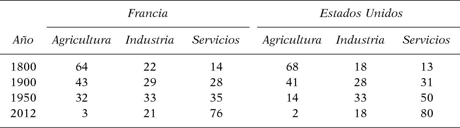 Nota: en 2012 la agricultura representaba 3% del empleo total en Francia, frente 21% para la industria y 76% para los servicios. La construcción, 7% del empleo en Francia en 2012, como en los Estados Unidos, se incluyó en la industria.
