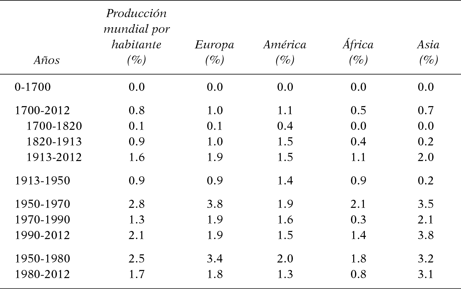 A nivel planetario, la tasa de incremento de la producción por habitante fue en promedio de 0.8% anual entre 1700 y 2012, del cual 0.1% entre 1700 y 1820, 0.9% entre 1820 y 1913, y 1.6% entre 1913 y 2012. Como indicamos en el cuadro II.1, se observa esa misma tasa de incremento promedio de 0.8% anual entre 1700 y 2012 en la población mundial.