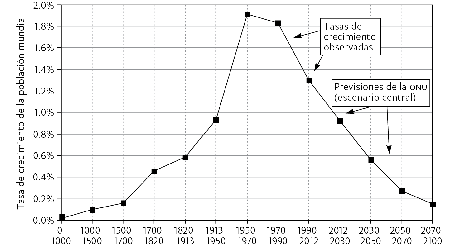 La tasa de crecimiento de la población mundial superó el 1% anual de 1950 a 2012 y debería volver a 0% hacia finales del siglo XXI.