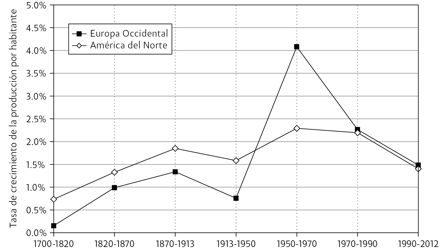 La tasa de crecimiento de la producción por habitante superó el 4% anual en Europa de 1950 a 1970, antes de regresar a los niveles estadunidenses.