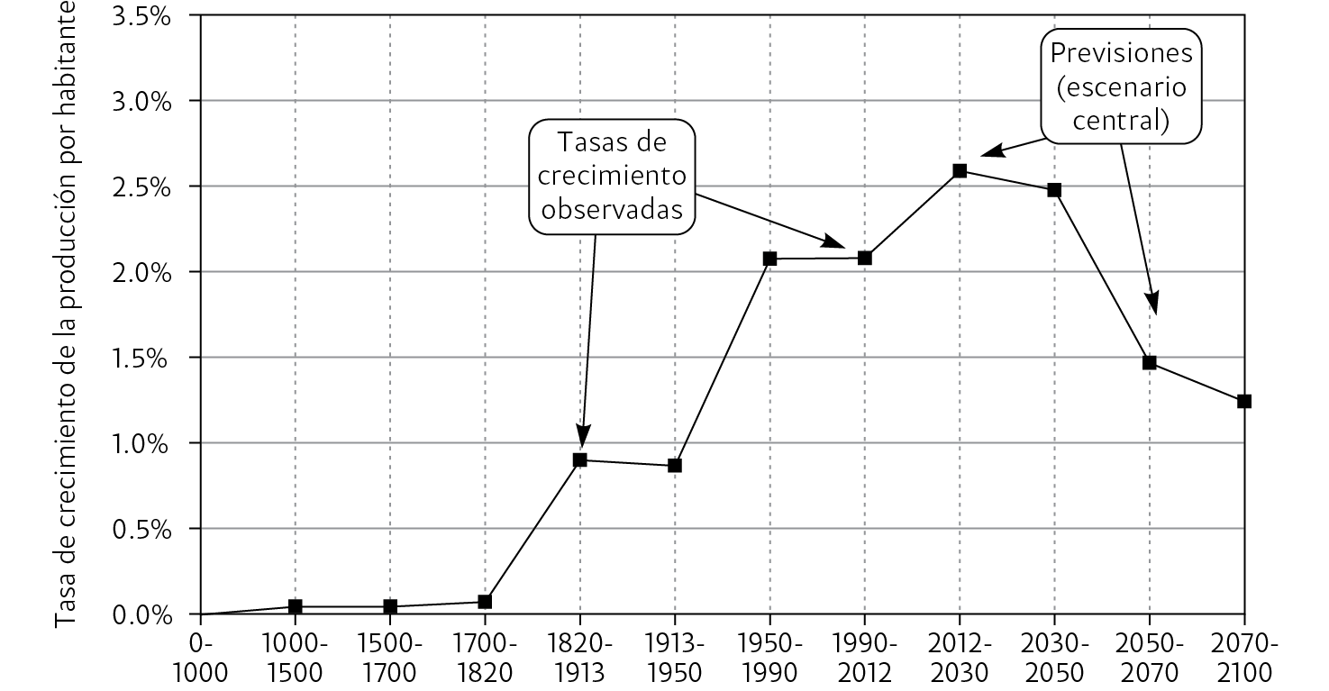 Abordemos ahora la cuestión del porvenir: ¿en el siglo XXI está destinado a desacelerarse inexorablemente el espectacular incremento de la producción por habitante, cuya realidad acabamos de recordar? ¿Nos dirigimos hacia el final del crecimiento por razones tecnológicas, ecológicas, o por ambas al mismo tiempo?
