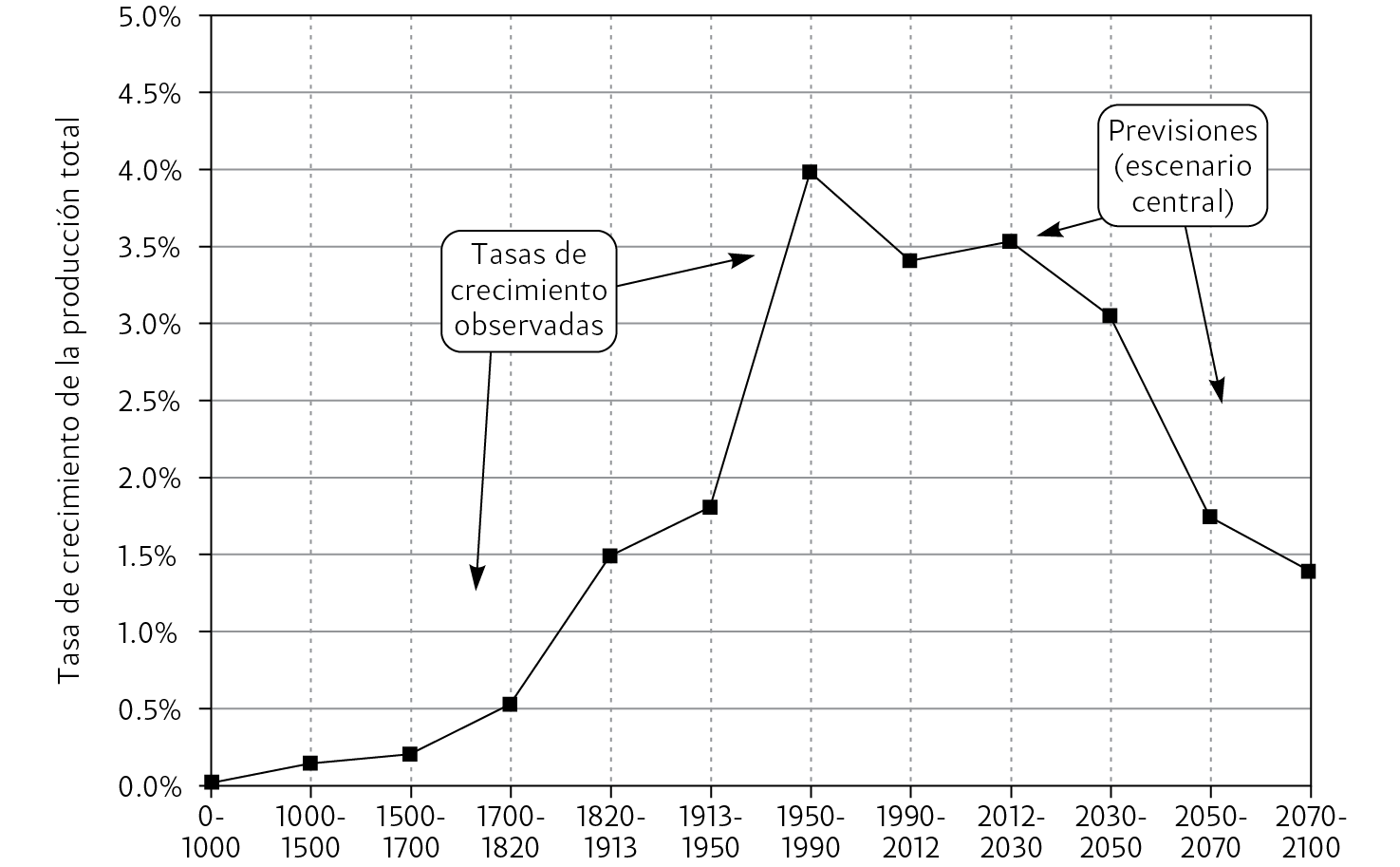 GRÁFICA II.5. La tasa de crecimiento de la producción mundial total desde la Antigüedad hasta 2100