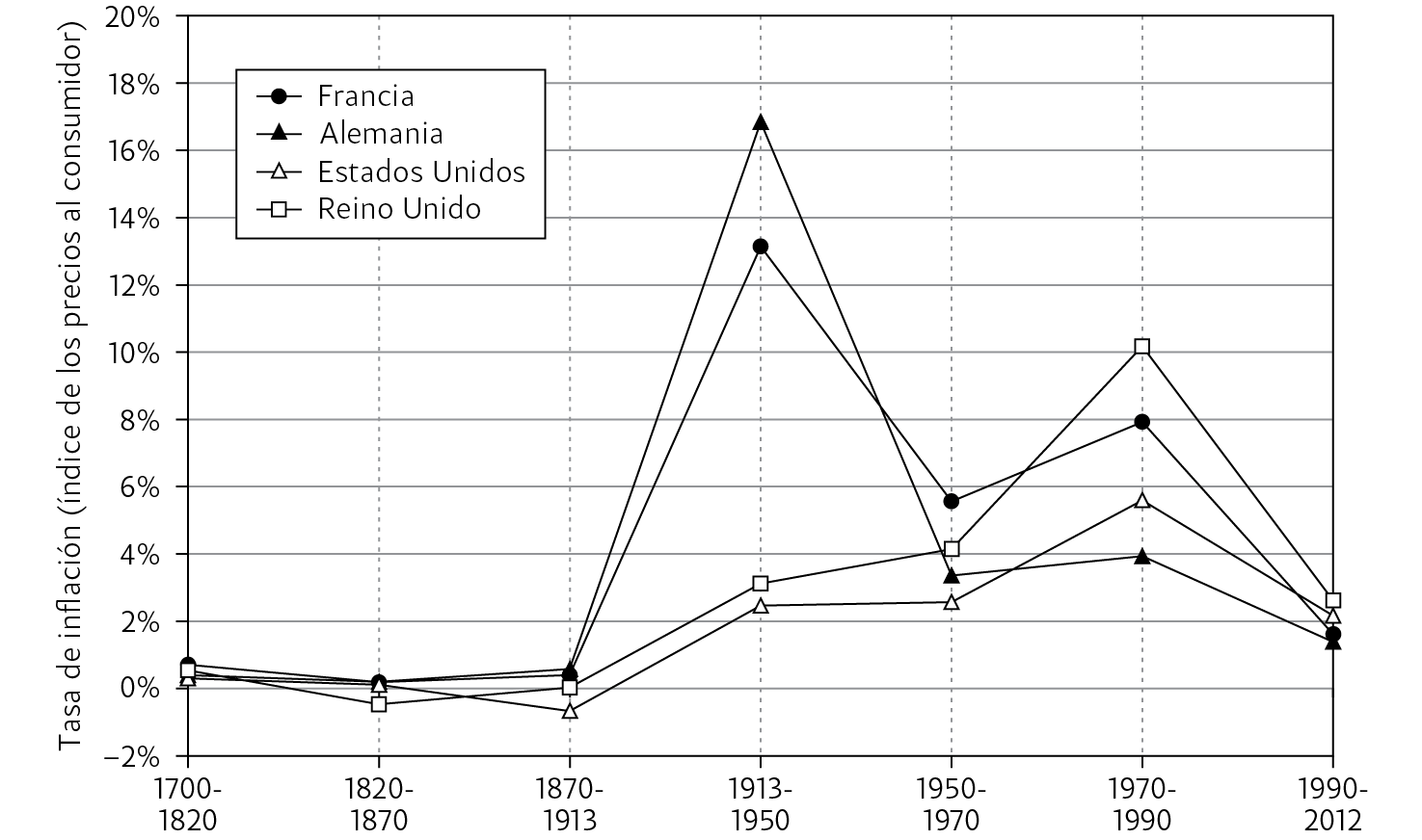 En particular, si se hace el promedio del alza de los precios en los periodos de 1700-1820 por una parte, y 1820-1913 por la otra, se observa una inflación insignificante tanto en Francia y el Reino Unido como en los Estados Unidos y Alemania: a lo sumo un 0.2-0.3% anual. A veces hasta se advierten niveles ligeramente negativos, como en el Reino Unido y en los Estados Unidos en el siglo XIX (−0.2% por año en promedio en ambos casos entre 1820 y 1913).