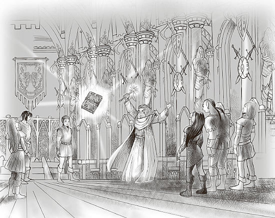 Fent un gest amb el cap, l’Arximag va donar les gràcies a Audaç, es va posar dret i va avançar una mica. Tot seguit va aixecar el bastó màgic, del qual va brollar una llum daurada que va envair la sala i que va obligar els cavallers a tancar els ulls. En tornar-los a obrir, van veure que del no-res havia aparegut un gran llibre amb la coberta laminada d’or i recoberta de gemmes precioses i símbols antics. De seguida es van agrupar al voltant d’Estel·làrius.