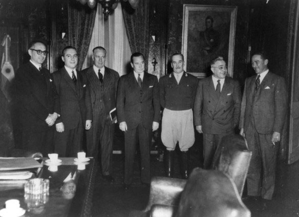 El general Aramburu (en el centro) reunido, desde la izquierda, con Arturo Frondizi, Laureano Landaburu, Teodoro Hartung, general Arturo Ossorio Arana, Ricardo Balbín y Julio C. Krause.