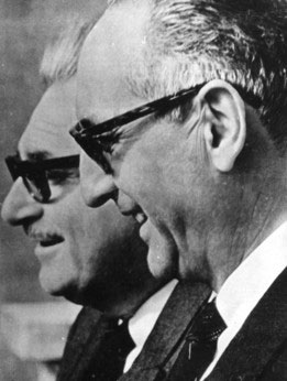 Alejandro Agustín Lanusse y el ministro del Interior, Arturo Mor Roig, revisan los cómputos electorales de las elecciones de 1973.