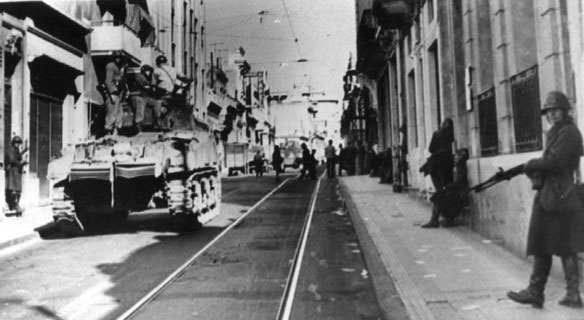 Soldados rebeldes apostados en la calle Humberto I mientras los tanques avanzan hacia la Plaza Constitución durante los sucesos de Azules y Colorados, septiembre de 1962.