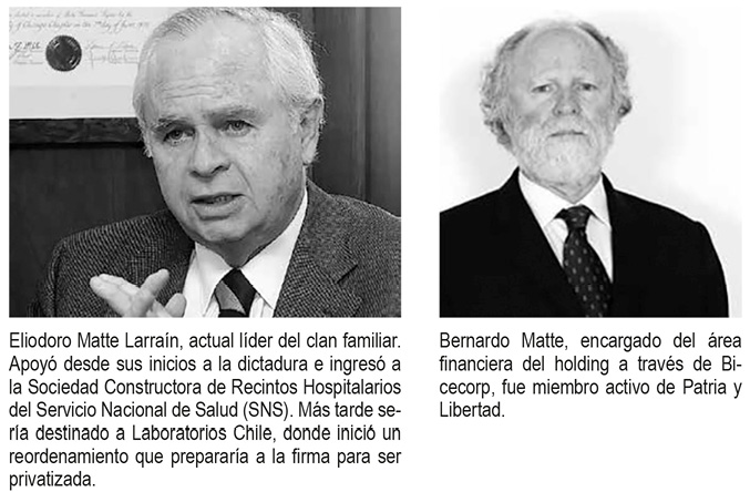 En 1976 comenzó el arribo a la industria del segundo hijo de Eliodoro, Eliodoro Matte Larraín, que asumió un puesto en el directorio de la empresa. Antes había llegado a la compañía su cuñado Jorge Larraín Bunster, casado con la mayor de los hermanos, Patricia. Con los años se les uniría el menor, Bernardo, el más parecido a su padre y, durante la Unidad Popular, militante de Patria y Libertad40.