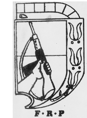 Figs.: El fusil y la tacuara en el emblema de Montoneros y un escudo peculiar en un volante del FRP (67)
