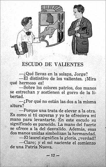 ¿Cómo se interpretaban los blasones que componen el Escudo en esos años? En el manual escolar mencionado se afirmaba que era el distintivo de «los valientes». El celeste y blanco del fondo, claro, eran los «colores patrios». Las manos sostenían el «gorro de la libertad» y el laurel representaba «la gloria». Hasta aquí los significados coincidían con los de los blasones del escudo nacional. Pero aparecían también algunas diferencias. El sol naciente era símbolo del «comienzo de la Patria Nueva», algo similar al sentido que tenía en el escudo patrio, pero por supuesto la «patria» al que éste aludía no era la peronista sino la que nacía en los albores del siglo XIX. Sobre la innovación principal del diseño la autora del manual se extendía algo más. El niño del delantal blanco preguntaba «¿Por qué no están las dos [manos] a la misma altura?», a lo que su compañero respondía: «Porque una trata de elevar a la otra. Es como si tú cayeras y yo te ofreciera mi mano para levantarte. En este escudo su significado es parecido. La mano del fuerte se ofrece a la del desvalido. Además, esas dos manos unidas simbolizan la hermandad». (15) En el escudo nacional, las manos entrelazadas sobre un plano horizontal también representaban unión y fraternidad. (16) Pero por supuesto no estaba presente la idea de esa solidaridad entre fuertes y desvalidos que simbolizaba el eje diagonal.