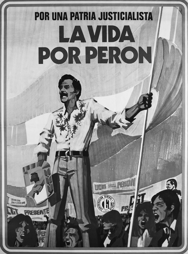 Fig.: José I. Rucci acribillado desde la izquierda, defendiendo al peronismo con el Escudo. Afiche producido por la CGT (1974). Museo del Bicentenario.