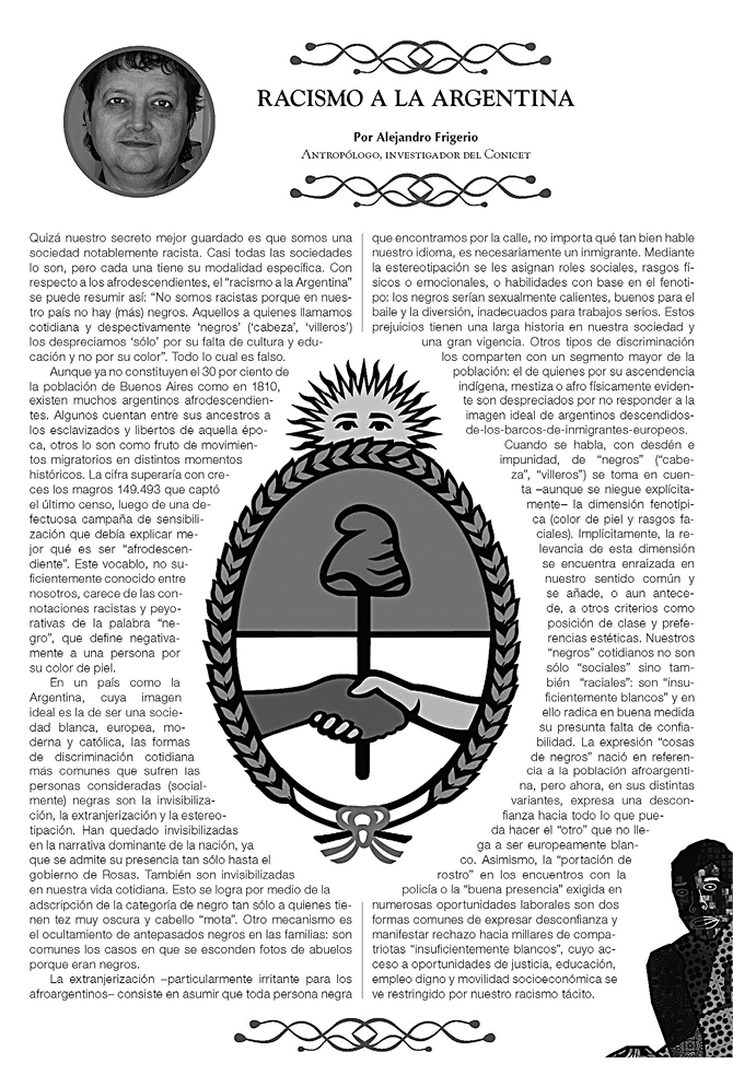 También esta vez las manos del escudo entraban en diálogo con otras imágenes similares que poblaban el paisaje de la época. Tomadas en conjunto, queda claro que en el momento actual de la cultura argentina, en el que las diferencias étnico-raciales se han vuelto tema de debate abierto, ya no parece que el lenguaje visual requiera sutiles interpretaciones. Como puede verse en las siguientes ilustraciones de aparición reciente, la tez de las manos en relación con la nación aparece utilizada de manera más bien explícita para tematizar el racismo y la necesidad de superarlo.